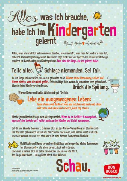 Dieses Plakat ist eine zarte Liebeserklärung an die Arbeit der ErzieherInnen in Kitas. ‚Alles, was ich brauche, habe ich im Kindergarten gelernt‘ erzählt von wesentlichen Fähigkeiten, auf die es im Leben ankommt und die im alltäglichen Zusammenleben im Kindergarten gelernt und gelebt werden: Freude an kleinen Dingen, Wertschätzung dessen, was ist, Rücksicht, Höflichkeit, Achtsamkeit für sich und andere und Zusammenhalt. Mit diesem DIN-A1-Plakat für die Öffentlichkeitsarbeit zeigt die Kita, dass sie viel mehr ist als nur eine reine Bildungseinrichtung.