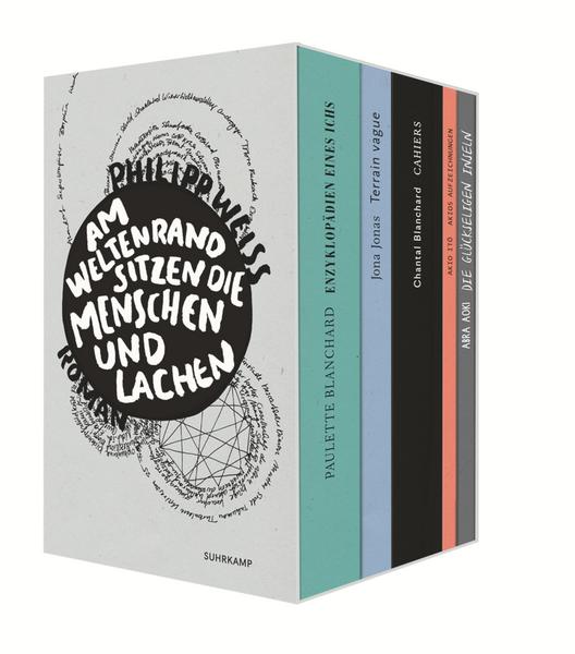 1000 Seiten, fünf Bände – ein Roman. In Am Weltenrand sitzen die Menschen und lachen erzählt Philipp Weiss von der Verwandlung der Welt im Anthropozän – jener Epoche der Erdgeschichte, in welcher der Mensch zur zentralen gestaltenden Kraft geworden ist. Zwischen Frankreich und Japan, zwischen dem 19. und dem 21. Jahrhundert, in Form von Enzyklopädie, Erzählung, Notizheft, Audiotranskription und Comic entwirft dieser kühne Roman ein Panoptikum unserer fliehenden Wirklichkeit. Die siebzehnjährige Paulette erlebt im Jahr 1871 den Aufstand der Pariser Kommune, bereist als eine der ersten europäischen Frauen das Japan der Meiji-Ära und liegt über hundertdreißig Jahre im Eis der französischen Alpen geborgen. Die Klimaforscherin Chantal, ihre Ururenkelin, folgt ihren Spuren nach Fernost, entwirft eine zynische Geschichte des Universums und entflieht zugleich einer Liebe und deren umstülpender Kraft. Der von ihr zurückgelassene Künstler Jona begibt sich auf die Suche, findet in Japan aber nicht Chantal, sondern eine vielfache Katastrophe: ein Erdbeben, eine Welle, einen Atomunfall. Der neunjährige Akio läuft tagelang durch zerstörtes Gebiet. Trost findet er bei Satoshi, einem obdachlosen Tagelöhner und AKW-Nomaden, der langsam an den Folgen der Strahlung stirbt. Durch einen Phantomschmerz getrieben, irrt die junge Japanerin Abra durch Tokio und verliert sich in den einsamen Schleifen ihres virtualisierten Selbst.