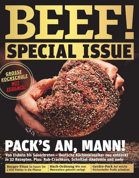 Männer kochen anders! Die Kochschule Dieses BEEF! special issue steht unter dem Motto ‚Pack´s an, Mann‘: Von Eisbein bis Sauerbraten – deutsche Küchenklassiker neu entdeckt in 32 Rezepten. Plus: Rub-Crashkurs, Schnitzel-Akademie und mehr. Und es gibt eine große Kochschule – mit Zeugnis! Außerdem: -Burger-Titan: So hauen Sie zwei Kilo Patties in die Pfanne -Hack-Ordnung: Wie man Meerestiere gekonnt zerlegt -Geräte-Park: Auf welche Küchenhelfer Profis schwören Ausstattung: mit zahlreichen Farbfotos