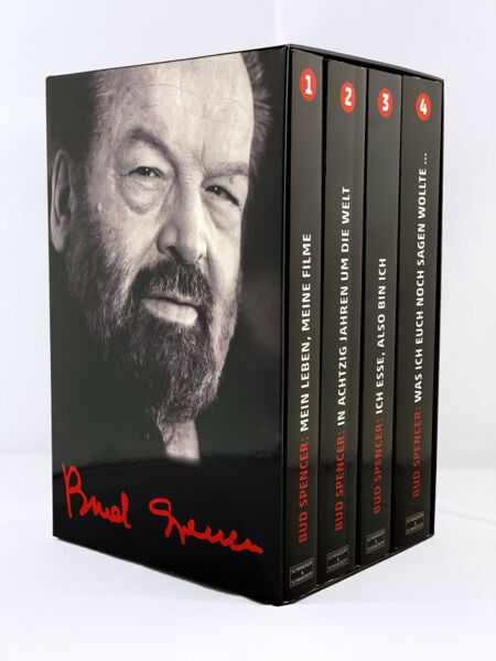 Der aus zahlreichen Kultfilmen bekannte Bud Spencer ist für viele seiner Fans der Held ihrer Kindheit und eine Vaterfigur, die sie bis heute vergöttern. In seinen Büchern verrät Carlo Pedersoli alias Bud Spencer mit viel Humor, wie er sich selbst sieht: als kauzigen Vollblutkünstler, dem das Wort »Ruhestand« fremd ist, und als treuen Familienmenschen, den nichts so schnell erschüttert. Carlo Pedersoli (1929 – 2016), war so imposant wie die von ihm verkörperten Figuren, aber er war noch viel mehr: ein intelligenter Jurist, ein ehemaliger Hochleistungsschwimmer, der zweimal an den Olympischen Spielen teilgenommen hat, und ein Kosmopolit, der viel gereist ist und noch mehr erlebt hat. Enthalten sind alle vier Bände der neuen Paperback-Ausgabe der vier Bücher von Bud Spencer! Der Preis beträgt nur den Originalpreis der vier Bücher, also 4 x 14,99 Euro = 59,96 Euro. Der Schuber ist dabei gratis.