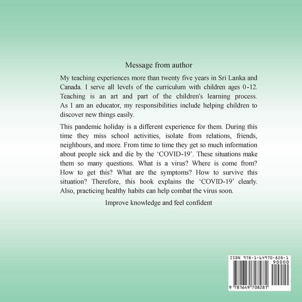 Children are very curious about investigating the world around them. This ‚COVID-19‘ pandemic situation is a new experience for them. During this time, they miss school activities, isolation from relations, friends, neighbours, and communities. From time to time they get so much information about people sick and die by the ‚COVID-19‘. Therefore, this situation stimulating them to many inquiries such as: What is the COVID-19? What is a virus? Where is come from? How to get this? What are the symptoms? How to survive this situation? So this book is explaining about COVID-19 clearly. Also, it’s helping to discover new things easily and make them feel confident. Learn and improve knowledge