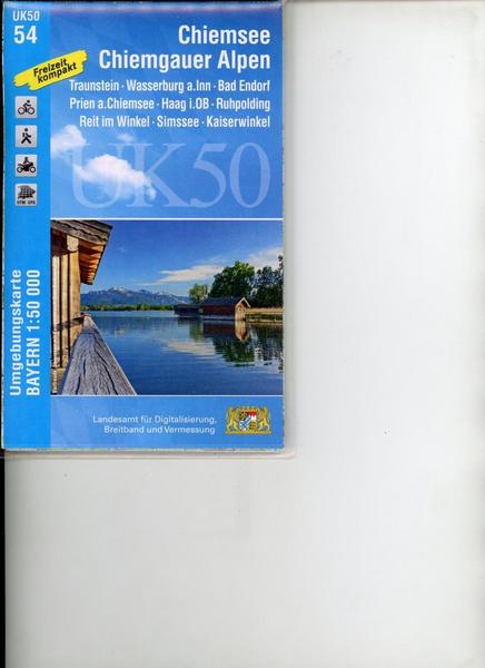 Die amtliche Reihe der UK50 (Umgebungskarte 1:50000) bietet für zusammenhängenden bayerische Regionen gezielte Freizeitinformationen. Kartengrundlage ist die DTK50 (Digitale Topographische Karte 1:50000) mit UTM-Gitter für GPS-Nutzer und Geländedarstellung. Die UK50-54 zeigt uns die Region rund um den Chiemsee mit den Chiemgauer Alpen im Süden der Karte. Das „Bayerische Meer“ mit seiner traumhaften Umgebung lädt Radler und Wanderer ein die Natur zu erkunden. Ein Wahres Vergnügen sind Touren rund um die Eggstätt-Hemhofer Seenplatte. An warmen Sommertagen laden die vielen kleinen Gewässer zu einer Erfrischung im kühlen Nass ein. In unberührte Biotope gelangt man bei einem Ausflug in die Naturschutzgebiete ‚Tiroler Achen‘ und ‚Kendlmühlfilze‘. Für Wanderer ist eine Tour auf die Kampenwand unausweichlich. Entweder zu Fuß oder entspannt mit der Gondel. Der Ausblick lohnt sich! Auch Hochries, Hochfelln und weitere Berge der Chiemgauer Alpen sind sehr lohnenswerte Ausflugsziele. Wer es ruhiger wünscht, wandert auf den Hochgern. Die Auswahl an Touren und Gipfeln ist schier endlos. Ganz im Süden der Karte wartet außerdem der Kaiserwinkl mit dem Kaisergebirge in Österreich. Dem Geschichts- und Kulturfreund bieten sich Traunstein, Wasserburg a.Inn oder Neubeuern an. Außerdem die Ameranger Museen und Klöster wie Kloster Gars a.Inn oder das Kloster Frauenchiemsee. Absolutes Muss ist nicht zuletzt ein Besuch im Schloss Herrenchiemsee auf der Herreninsel. Kartenblatt UK50-54 Chiemsee, Chiemgauer Alpen REGIONEN: Oberbayern, Chiemgau, Chiemgauer Alpen, Kaiserwinkl, Kaisergebirge ORTE: Traunstein, Wasserburg a.Inn, Bad Endorf, Prien a.Chiemsee, Haag i.OB, Ruhpolding, Reit im Winkl, Simssee, Kampenwand, Kendlmühlfilze, Tiroler Achen, Schloss Herrenchiemsee, Herreninsel, Inn, Alz