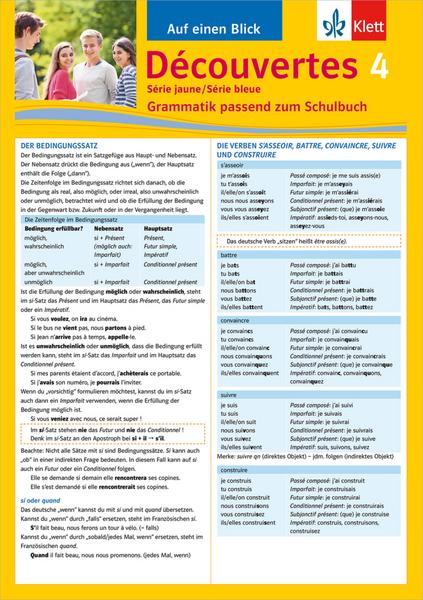 Französisch-Grammatik auf einen Blick – passend zum Schulbuch Passt zu den Schulbüchern: Découvertes Série bleue 4 ISBN: 978-3-12-622141-2 und Découvertes Série jaune 4, Französisch, 4. Lernjahr, Klasse 9, ISBN: 978-3-12-622041-5 (fester Einband) und ISBN: 978-3-12-622042-2 (flexibler Einband) Grammatik eines Schuljahres passend zu Découvertes Série jaune / Série bleue – immer griffbereit zum Nachlesen und Wiederholen. I deal für die Schule, für zu Hause und unterwegs. Mit abwaschbarer strapazierfähiger Laminierung. Praktisch: mit seitlicher Lochung zum Abheften in jedem Ordner.