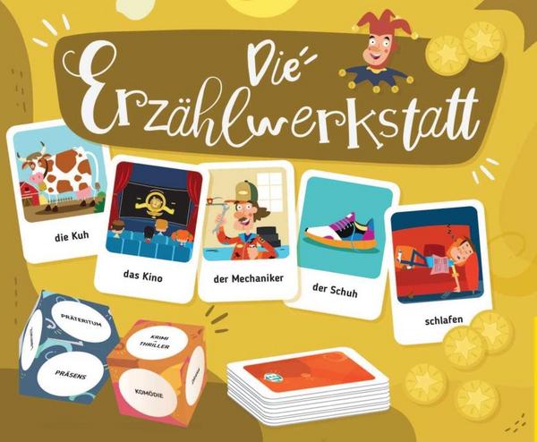 Die Erzählwerkstatt ist ein unterhaltsames Kartenspiel zum Bauen von Sätzen oder Erfinden von Geschichten, bei denen einzelne sprachliche, illustrierte Elemente vorgegeben sind. Die Auswahl an Personen, Tieren, Orten, Gegenständen und Handlungen garantieren eine vielseitige Kombinationsmöglichkeit. Das Spiel fördert die Erweiterung des Wortschatzes, festigt die Grammatik, die Konjugation der Verben in verschiedenen Zeiten und den Satzbau. Mit Ermutigung zur Fantasie und freien Formulierung wird das Verbinden der einzelnen Elemente zu einem Satz oder einer Geschichte ein Erfolgserlebnis und motiviert zu einer immer selbständigeren Sprachverwendung. Das Spiel besteht aus 132 Karten, die je nach Kategorie in fünf verschiedenfarbige Stöße aufgeteilt sind: 20 Karten mit Personenbezeichnungen (violette Karten), 20 Karten mit Tierbezeichnungen (grüne Karten), 20 Karten mit Ortsbezeichnungen (orangefarbene Karten), 20 Karten mit Gegenständen aus dem Alltag (rote Karten), 42 Karten mit häufig verwendeten Verben (blaue Karten). Auf jeder Karte befindet sich ein Bild und das entsprechende Wort. Zu jeder Kategorie gibt es auch zwei Joker. Weiteres Zubehör: 1 Würfel zum Anzeigen der Art der Erzählung, 1 Würfel zum Anzeigen der Erzähl- bzw. Verbzeiten, 60 Spielmarken.