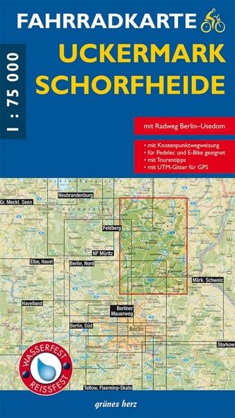 Die Fahrradkarte „Uckermark; Schorfheide“ vom Verlag grünes herz wurde in enger Zusammenarbeit mit den Ämtern sowie den Tourismusvereinen der Region erarbeitet. Das Biosphärenreservat Schorfheide-Chorin bildet das Zentrum der in der Karte dargestellten Tourismusregion. Die Karte reicht von Zehdenick und Lychen im Westen bis nach Angermünde im Osten sowie Prenzlau und Carwitz im Norden und Wandlitz und Biesenthal im Süden. Im Kartenbild finden sie, neben den eben genannten Städten, auch solch touristisch interessante bzw. bedeutende Orte wie Basdorf, Chorin, Eberswalde, Groß Schönebeck, Joachimsthal, Liebenwalde, Niederfinow und Templin. Neben den Radfernwegen, wie Berlin-Usedom und der Tour Brandenburg, sind auch alle regionalen Radwege, z. B. der Uckermärkische Radrundweg, der Wallpfad, der Oder-Havel-Radweg und die Radrouten Historischer Stadtkerne enthalten. Die Fahrradkarte im Maßstab 1 : 75.000 ist 90 x 63 cm groß. Ein weiteres Qualitätsmerkmal dieser neuen Karte ist, dass diese auf wasser- und reißfestem sowie recyclingfähigem Material gedruckt wurde. Das Besondere an dieser Karte ist, dass hierin die Oberflächen der Radstrecken in drei unterschiedlichen Qualitätsstufen dargestellt sind. Radwege/autofreie Strecken und Radrouten auf öffentlichen Straßen und Wegen sind farblich unterschieden. Außerdem sind unvermeidbare Lückenschlüsse mit höherem Kfz-Aufkommen, ungeeignete bzw. gesperrte Wege und Straßen sowie Steigungen ausgewiesen. All diese Informationen sind eine wichtige Hilfe für die Tourenplanung. Die farbliche Unterlegung hebt den Verlauf der Radfernwege hervor, deren Markierungssymbole ebenfalls in die Karte mit aufgenommen wurden. Gleichzeitig sind die Radstecken mit Entfernungsangaben versehen, an den Radfernwegen auch mit Langdistanzangaben zwischen zwei wichtigen Stationen.