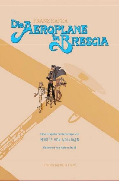 Der Frankfurter Zeichner Moritz von Wolzogen hat eine farbenprächtige Graphische Reportage geschaffen. Diese orientiert sich an einem wenig bekannten journalistischen Text des jungen Franz Kafka aus dem Jahre 1909: Die Aeroplane in Brescia. 1909 – Es ist das Jahr, in dem Louis Blériot in seinem selbstgebauten Eindecker den Ärmelkanal überquert. Im September macht Franz Kafka mit seinen Freunden Max und Otto Brod Urlaub in Riva am Gardasee. Dort erfahren die Freunde von der Flugschau in Brescia, an der auch der berühmte Blériot teilnehmen wird. Die Freunde machen sich auf den Weg dorthin und werden Zeugen eines bahnbrechenden Ereignisses der Geschichte der Aviatik. In Prag schreibt Franz Kafka über dieses Erlebnis. Seine Reportage erscheint kurz darauf in der deutschsprachigen Prager Tageszeitung Bohemia, allerdings in stark gekürzte Form. Der Zeichner Moritz von Wolzogen widmete sich über Jahre dem Originaltext in seiner gesamten Länge und hat sich diesen als Inspirationsquelle für den vorliegenden Comic erschlossen. Der Begriff Graphische Reportage stammt von ihm. Diese Graphische Reportage ist eine künstlerische Adaption des gleichnamigen Textes von Franz Kafka. Dabei handelt es sich jedoch nicht um eine reine Textillustration. Denn Moritz von Wolzogen interpretiert gekonnt die Ereignisse und Eindrücke, die zur Entstehung des Textes geführt haben. Im Medium der Graphischen Reportage wird nicht nur der kaum bekannte Text Kafkas lebendig, sondern auch Raum für eine neue Form der Kafka-Interpretation geschaffen. Ein junger und abenteuerlustiger Franz Kafka wird uns hier in den herrlichsten Farben vorgestellt. In seiner individuellen ästhetischen Sprache lässt Moritz von Wolzogen die Zeit des frühen 20. Jahrhunderts auf nur wenigen Seiten lebendig werden: die italienische Mode des frühen Novecento, die chaotischen Verhältnisse in einer Stadt wie Brescia, die Idylle am Ufer des Gardasees und die Helden der Zeit – die Aviatiker und ihre beeindruckenden Maschinen. Der Zeichner taucht seine Figuren und Szenen ein in Farben der Moderne und lässt mit flink gesetztem Strich das Tempo einer Epoche des Aufbruchs fassbar werden.