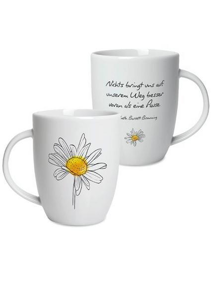 ‚Nichts bringt uns auf unserem Weg besser voran als eine Pause‘ – Elisabeth Barrett Browning Mit der Porzellan-Tasse mit zarter Margerite und dem inspirierendem Spruch aus dem Caritas-Tagesabreißkalender starten Sie morgens genussvoll und gutgelaunt in den Tag. Ob für das Frühstück zuhause oder die Kaffeepause auf der Arbeit, die Tasse ist ein echter Hingucker. Auch ein ideales Geschenk, um anderen eine Freude zu machen! Produktdetails: Höhe: 9,6 cm Ø: 7,8 cm Material: Porzellan Verpackung: in Geschenkkarton Inhalt: 0,28 l Spülmaschinenfest Hergestellt in der EU Die Geschenktassen gibt es in vier Motiven (Mohnblume, Sonnenblume, Margerite und Kornblume) und sind einzeln oder als 4er-Set mit allen vier Motiven erhältlich.