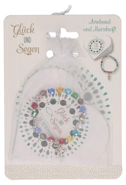 Das schöne Geschenkset ‚Glück und Segen zur Erstkommunion‘ besteht aus einem bunten Stretch-Armband und einem Geschenkheft in Herzform. Das Armband ist aus bunten Glasperlen und mit Kreuzanhänger aus Metall arrangiert, das bei vielen Gelegenheiten getragen werden kann. Das Armband hat einen Durchmesser von ca. 4,5-5 cm. Das Geschenkheft hat 16 Seiten, mit Gebeten, Segenswünschen und Texten von Frau Irmgard Erath. Dieses Herzheft hat die Masse von 9 x 9 cm, die Seiten sind liebevoll mit Illustrationen gestaltet. Das Thema des Geschenksets ist der Segen Gottes zur Erstkommunion. Sowohl das Armband als auch das Heft sind in einem durchsichtigen Organzabeutel verpackt. Mit diesem liebevoll designten Geschenkset macht man Kindern zur Erstkommunion eine Freude. Das Geschenkset wird auf passender Backcard mit praktischer Eurolochung geliefert.