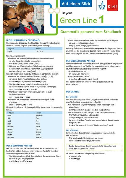 Grammatik auf einen Blick – passend zum Schulbuch Passt zum Schulbuch Green Line 1, Ausgabe Bayern ab 2017, Klasse 5 ISBN: 978-3-12-803010-4 Das Erfolgsformat jetzt auch für die neue Green Line Generation! Optimal abgestimmt auf das Schulbuch, fasst die Grammatik eines Schuljahres schnell, übersichtlich, effizient zusammen. Grammatik passend zum Schulbuch – immer griffbereit zum Nachlesen und Wiederholen Ideal für die Schule, für zu Hause und unterwegs Mit abwaschbarer, strapazierfähiger Laminierung Für Schülerinnen und Schüler, die mit dem entsprechenden Klett-Lehrwerk lernen.