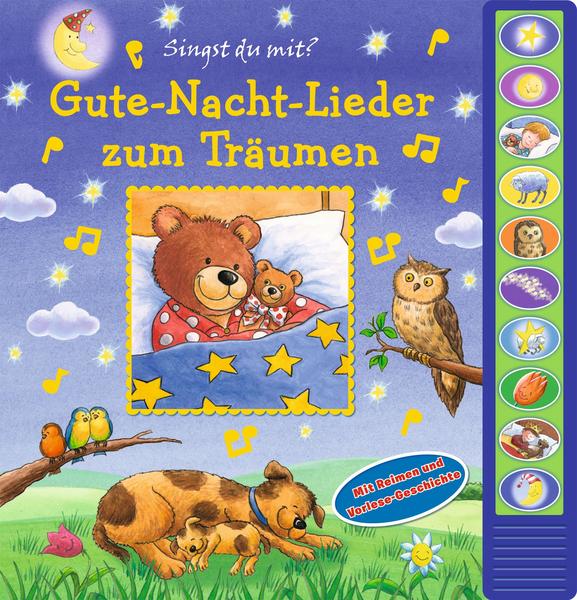 ‚Zehn beliebte Gute-Nacht-Lieder laden zum Mitsingen ein. Stimmungsvolle Einschlaf-Reime und eine wunderschöne Gute-Nacht-Geschichte zum Vorlesen helfen dabei, den Tag entspannt ausklingen zu lassen. Folgende Lieder sind enthalten: Weißt du, wie viel Sternlein stehen? Der Mond ist aufgegangen Müde bin ich, geh zur Ruh Schlaf, Kindchen, schlaf Abend wird es wieder Der Sandmann ist da Wer hat die schönsten Schäfchen? Die Blümelein, sie schlafen Schlafe, mein Prinzchen, schlaf ein Guter Mond, du gehst so stille Mit liebevoll illustrierten Geschichten, Liedtexten, Noten und Melodien entdecken Kinder gemeinsam mit ihren Eltern die Freude am Singen und Lesen und erweitern ihren Wortschatz. Das farbig illustrierte, gebundene Pappbilderbuch von pikids sammelt auf 40 detailreichen Seiten bekannte und beliebte Kinderlieder mit Notensatz und lädt zum Mitsingen ein. Eine kurze Gute-Nacht-Geschichten zum Vorlesen, Reime und stimmungsvolle Lieder sind ideal für das tägliche Einschlafritual und bereiten Kleinkinder optimal auf das Zubettgehen vor. Die Kinder können dieses strapazierfähige und stabile Kinderbuch auch selbstständig entdecken. Dieses kleinkindgerechte Bilderbuch mit wattiertem Umschlag und Fenster ist ein tolles Geschenk für Jungen und Mädchen ab 18 Monaten und gut geeignet für unterwegs.‘
