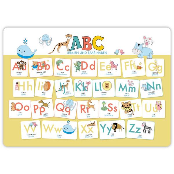 Das ABC-Mini-Lernposter (Glanzlack beschichtet und abwischbar) mit fröhlichen Tieren lädt Kinder zum spielerischen Alphabet Lernen ein. Es kann sowohl als Poster im Kinderzimmer, Kindergarten, oder der Vorschule und Schule aufgehängt werden, aber auch als Schreibtischunterlage, Arbeitstafel oder Platzset benutzt werden. Mit den lustigen Tieren lernen Mädchen und Jungen die bunte Welt des ABC kennen. Die farbenfröhlichen und kindgerechten Illustrationen unterstützen zusätzlich visuell. So können Kinder anschaulich das Alphabet mit Groß- und Kleinbuchstaben lernen und entdecken dabei neue Tiere. Das von Hand designte, lustige Tier-ABC-Lernposter ist die ideale Ergänzung zu den anderen ABC-Lernmaterialien von Stay Inspired! by Lisa Wirth. Produktmerkmale: – Vorderseite mit Glanzlack beschichtet und abwischbar – Format: DIN C3 Querformat: 324 x 458 mm – Abgerundete Ecken – Stabiler, hochwertiger 450 g Karton