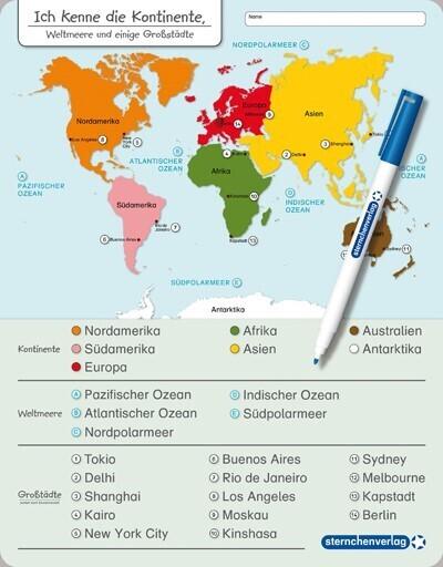 Jedes Kind kann auf der Rückseite das Feld ausfüllen und sich mit Hilfe der Vorderseite selbstständig kontrollieren. Hier können die Kontinente, Weltmeere und einige Großstädte immer wieder geübt werden. Prima geeignet für jeden Schüler im Unterricht und für zu Hause. Praktisch und sauber, trocken abwischbar ohne zu schmieren und ohne Farbrückstände. Karte mit Spezialstift- Made in Germany Weiterhin in der Reihe erschienen: Ich kenne Deutschland – Bundesländer und Landeshauptstädte ISBN 978-3-939293-22-4 Ich kenne Deutschland – Deutschlands Flüsse ISBN 978-3-939293-97-2 Ich kenne Deutschland – Kombi mit allen 3 Karten und 1 Stift 978-3-946904-05-2