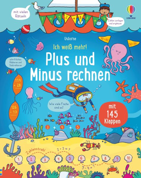 Löse die Plus- und Minusaufgaben in diesem interaktiven Buch, 145 Klappen verbergen die Lösungen. Am Ende kannst du dein Wissen mit dem Mathe-Monster-Brettspiel testen!