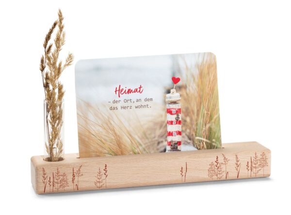 Dieser edle Halter mit einem Schlitz zum Aufstellen von Karten und einer Vase für eine passende Blume passt hervorragend auf jeden Schreibtisch und in jedes Regal. Kombinieren Sie eine Karte mit ermutigendem Spruch oder schönem Design mit einer schönen Blume oder einem hübschen Zweig aus dem Garten. Stellen Sie geschenkte Karten gut sichtbar auf anstatt sie in einer Schublade verschwinden zu lassen. Der Halter eignet sich auch hervorragend als Geschenk – schon mit einer Karte und einer Blume befüllt. Maße: ca. 23,8 x 4 x 3 cm, Höhe inkl. Reagenzglas ca. 8,8 cm, Buchenholz, hergestellt in Deutschland