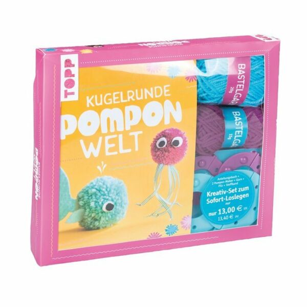 Ein toller Einstieg in die Welt der bunten Pompons und ein kreativer Zeitvertreib. Mit diesem Set für Kinder ab 6 Jahren kann sofort losgebastelt werden. Im Set enthalten ist ein Buch mit tollen Bastelideen und alles was man braucht, um einen süßen Wal und eine lustige Krake zu basteln. Zwei Pomponmaker in unterschiedlichen Größen, Wolle in zwei Farben (100% Polyacryl), Bastelfilz und Stoffband.