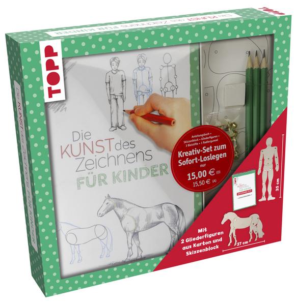 Spielend einfach zeichnen lernen – Das Set zum Sofort-Loslegen. In diesem Kreativ-Set befinden sich 2 Gliederfiguren aus Karton. Damit lassen sich verschiedene Körperhaltungen legen und einfach abmalen – so gelingen die ersten Kunstwerke noch einfacher. Das Set enthält eine kleine Kinderzeichenschule mit vielen Schritt-für-Schritt-Zeichnungen. Mit dem Skizzenbuch und den Bleistiften können Kinder ab 9 Jahren sofort loslegen. Das ideale Geschenk zum Kindergeburtstag und andere Anlässe.