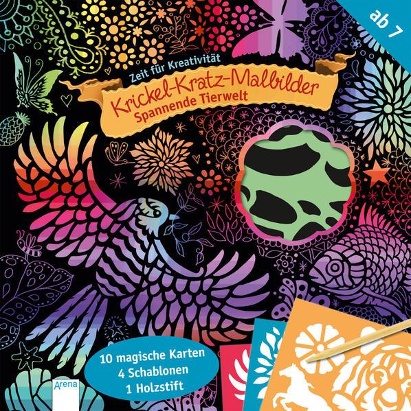 Aus schwarzen Flächen entstehen eigene Welten. Mit dem Holzstift und den vier Schablonen entscheidet jeder selbst, welche Tiere und Landschaften in allen Farben erstrahlen.