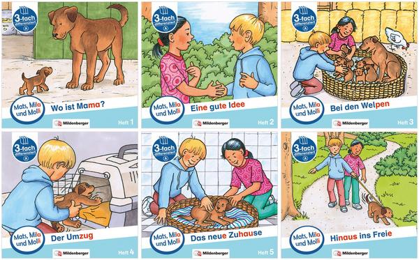 Alle Kinder lernen die gleiche Geschichte kennen. Jedes Kind kann die Geschichte in 6 Folgen (Heft 1 bis 6) entsprechend seiner Fähigkeiten (Schwierigkeitsstufe A, B oder C) erlesen. Anschließend können alle Kinder gemeinsam über diese eine Geschichte sprechen und diskutieren. Die unterschiedlichen Zugänge zu den 6 Fortsetzungsgeschichten führen zu einem gemeinsamen Erlebnis. Der Inhalt stiftet Gemeinsamkeit. Kein Kind muss allein zurück bleiben. Im Laufe der Zeit kann jedes Kind sich an den drei Schwierigkeitsstufen der Geschichten versuchen. So wird Lernfortschritt ganz praktisch erfahrbar. Das spornt an und macht Mut. • Heft 1: Wo ist Mama? • Heft 2: Eine gute Idee • Heft 3: Bei den Welpen • Heft 4: Der Umzug • Heft 5: Das neue Zuhause • Heft 6: Hinaus ins Freie Schwierigkeitsstufe A Typografische Mittel – Sehr einfach (kompakt mit Streubildern): • Silbenmarkierung • erhöhter Silben- und Wortabstand • Streubilder • große Fibel-Schrift • farbige Illustrationen zu jeder Textseite Sprachliche Mittel • Streubilder ersetzen Nomen • Begleitsätze zur wörtlichen Rede werden durch Streubilder ersetzt • wenige lange Wörter • wenige seltene Wörter • wenige Attributergänzungen • kurze, einfache Sätze – eine fortlaufende Geschichte wird erzählt • geringer Textumfang