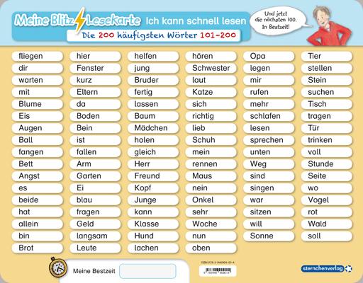Die 100/200 häufigsten Wörter, die Kinder in der Grundschule verwenden, machen etwa 50% der Wörter eines Textes aus. Es macht also Sinn diese zügig lesen und richtig schreiben zu können. Zum Üben dieser Wörter dient das Blitzlesen. Die Schüler sollen die Wörter auf einen Blick erkennen und lesen. Durch das Üben werden die Kinder sicherer und verinnerlichen diesen wichtigen Wortschatz. Die Bestzeiten können in einem Feld mit einem Folienstift immer wieder neu eingetragen werden. Stabile Tafel im großen Format 32,5 x 25 cm (Vorder- und Rückseite)