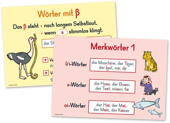Poster für den Klassenraum, Fach: Deutsch, DaZ, Klasse 3 und 4 +++„Wie schreib ich denn ‚Bäume‘? Ach ja, mit äu – das kommt ja von ‚Baum‘. Das merk ich mir!“ Kompakte Merk-Poster gehören als Organisationshilfe zu der essenziellen Ausstattung eines jeden Klassenzimmers. Ob lautgetreue Wörter, Regelwörter oder Merkwörter – beim Richtig-Schreiben-Lernen ist es wichtig, sich jederzeit rechtschriftliches Grundwissen auf einen Blick in Erinnerung rufen zu können. Die jeweils 12 übersichtlichen und dekorativen A3-Plakate zu den wichtigsten Rechtschreibphänomenen, -regen und Rechtschreibstrategien – etwa zu doppelten Mitlauten, Wörtern mit ß oder mit Dehnungs-h – geben blitzschnell Auskunft und fördern so das selbstverantwortete Lernen. Und auf die Frage: „Hab ich das richtig geschrieben?“ können Sie beim nächsten Mal antworten: „Schau erst mal aufs Merk-Poster!“