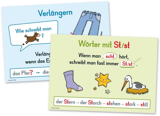 Poster für den Klassenraum, Fach: Deutsch, DaZ, Klasse 1–3 +++„Wie schreib ich denn ‚Bäume‘? Ach ja, mit äu – das kommt ja von ‚Baum‘. Das merk ich mir!“ Kompakte Merk-Poster gehören als Organisationshilfe zu der essenziellen Ausstattung eines jeden Klassenzimmers. Ob lautgetreue Wörter, Regelwörter oder Merkwörter – beim Richtig-Schreiben-Lernen ist es wichtig, sich jederzeit rechtschriftliches Grundwissen auf einen Blick in Erinnerung rufen zu können. Die jeweils 12 übersichtlichen und dekorativen A3-Plakate zu den wichtigsten Rechtschreibphänomenen, -regeln und Rechtschreibstrategien – etwa zu Groß- und Kleinschreibung, Umlauten oder Auslautverhärtung – geben blitzschnell Auskunft und fördern so das selbstverantwortete Lernen. Und auf die Frage: „Hab ich das richtig geschrieben?“ können Sie beim nächsten Mal antworten: „Schau erst mal aufs Merk-Poster!“