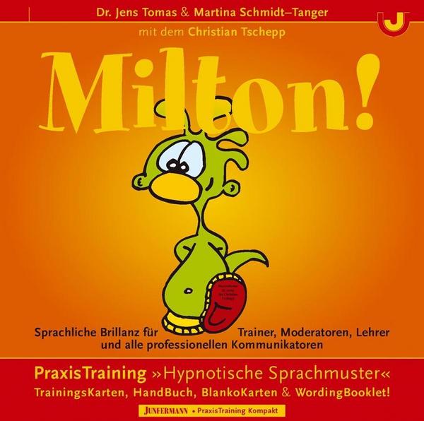 Stabile Box mit Handbuch (96 Seiten, vierfarbig), Wording-Booklet (24 Seiten) als Sprachschatzkästchen zum Notieren genialer Zitate, Aussagen, Sprüche etc., mit 63 Übungskarten (vierfarbig), 19 Blankokarten (auf denen Sie eigene Sprachmuster kreieren können) sowie einer CD, mit deren Hilfe Sie sich in hypnotische Sprachmuster einhören können. Gekonntes Sprechen und Kommunizieren erreicht andere Menschen und bringt den gewünschten Erfolg. Ob Seminar, Training, Präsentation, Gruppenmeeting oder Großveranstaltung: Die MILTON!-Trainingskarten bieten hochwirksame Sprachmuster, die Sie sicher und souverän machen. Lernen Sie Schritt für Schritt die besten Sprachmodelle … und die Qualität Ihrer Präsentationen, Trainings- und Gruppenleitungsfähigkeiten wird sich nach kurzer Zeit verbessern. Die MILTON!-Wordings ermöglichen Ihnen: – schwierige Anfangssituationen sprachlich brillant zu gestalten, – einen normalen Trainingsbeginn in einen wirklich guten Trainingsbeginn zu verwandeln, – die volle Aufmerksamkeit der Teilnehmer zu erhalten für das, was Sie sagen, erklären, demonstrieren wollen, – Teilnehmer immer wieder ganz nebenbei zur Mitarbeit zu motivieren, – sprachlich souverän im Umgang mit schwierigen Gruppensituationen und gestörter Arbeitsfähigkeit zu agieren, – bei Tests und Prüfungen zielorientierte positive Grundhaltungen zu manifestieren, – den Lern- und Wissenstransfer so zu gestalten, dass sich Ihre Teilnehmer wirklich erinnern, – Gruppen deutlich entspannter, flexibler und sprachgeschickter zu leiten.
