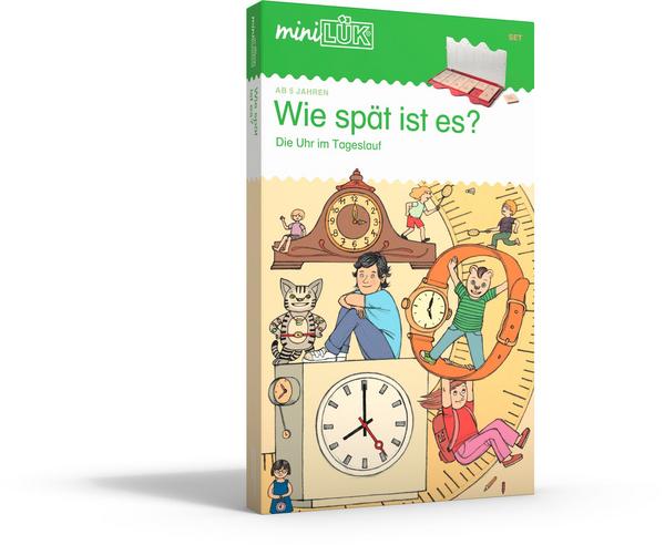 Die Uhr im Tagesverlauf Erste Uhrzeiten sind die leicht zu erlernenden Uhrzeiten von 1 bis 12 Uhr im Tagesverlauf. Der Mittag (12 Uhr) mit dem höchsten Stand der Sonne teilt den Tag in Vormittags- und Nachmittagszeiten . In diesem Rahmen werden Uhrzeiten mit Angaben kurz vor und kurz nach vollen Stunden geübt, Uhrzeiten mit viertel und halben Stunden sowie 5 und 10 Minuten vor und nach vollen Stunden anhand von analogen Uhren (mit Zifferblatt). Außerdem sind die Uhrzeiten zu verschiedenen Aktivitäten im Tagesverlauf der Kinder zu bestimmen und die Endzeiten von Back- und Kochvorgängen. Die systematischen Übungen der einfachen Uhrzeiten bilden die Grundlage für das Erlernen auch der komplizierten Uhrzeiten. Das optimale Geschenkset für Vorschulkinder.