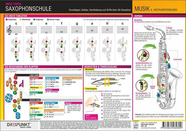 Das Saxophon entwickelt sich derzeit zu einem der beliebtesten Holzblasinstrumente. Sein markanter Klang unterstützt diverse Musikrichtungen, von der Dixie-Band bis zu aktuellen Chart-Hits. Durch mechanisierte Produktionsverfahren sind die einst sehr teuren feinmechanischen Instrumente heute für jeden erschwinglich geworden. Lernen Sie, ein faszinierendes Instrument zu spielen! Durch die wasserfeste Laminierung ist die zweiseitige Info-Tafel unzerreißbar und äußerst robust. 2. überarbeitete Auflage