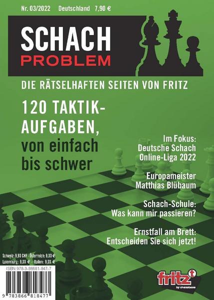 SCHACH PROBLEM ist ein Schachbuch, das Spaß macht: über 100 Schach-Taktikaufgaben von ‚einfach‘ bis ‚Bundesliga‘-Niveau. Für jeden ist etwas dabei, beginnend mit einzügigen Matts und endend bei schwierigen Kombinationen. Das neue Schach-Problem Heft 3/2022 mit dem Schwerpunktthema: Deutsche Schach-Online-Liga (DSOL)2022. Diese Veranstaltung hat nach dem Ende der Pandemie viele Anhänger gefunden, so dass sich der Deutsche Schachbund entschlossen hat, dieses Turnier zusammen mit ChessBase erneut durchzuführen. Insgesamt 320 Mannschaften haben mitgespielt, in zehn Ligen spielten, insgesamt 1.280 Spieler. Die Partien boten reichlich und unterhaltsames Schach. Die Anordnung der Taktikaufgaben erfolgt im Wesentlichen nach Schwierigkeit, beginnend mit einfachen Matts und endend beachtlichen Herausforderungen. In unserer Schach-Schule widmen wir uns dem Phänomen, das gegnerische Möglichkeiten unterschätzt oder übersehen werden. Neben schachlicher Unterhaltung bietet der Abschnitt praktisch wichtiges Anschauungsmaterial. Den Abschnitt „Meisterlich Kombinieren“ widmen wir dem aktuellen Europameister, Großmeister Matthias Blübaum. Im Abschnitt „Der Ernstfall am Brett“ geht es um Aufgaben, mit denen die Kontrahenten, in einer Partie konfrontiert wurden und es nicht immer eine klare Lösung gibt. SCHACH PROBLEM ist ein Schachheft, das Spaß macht: 134 klassische Schach-Taktikaufgaben von ‚einfach‘ bis ‚Großmeister‘-Niveau. Für jeden ist etwas dabei. Beginnend mit einzügigen Matts und Materialgewinnen, die Lust auf mehr machen, steigt der Schwierigkeitsgrad an. Am Ende das besondere Kapitel „Sie sind am Zug .. jetzt!. Hier geht es um pragmatische Entscheidungen während der Partie, nicht unbedingt um Kombination. Ein anspruchsvolles „Sahnehäubchen“ auf die Taktik-Aufgaben. • 120 Taktikaufgaben. • Im Fokus: DSOL 2022 • Taktik-Schule: Was kann mir passieren • Ernstfall am Brett: Entscheiden Sie sich – jetzt! • Schachbuch mit 88 Seiten (keine DVD)