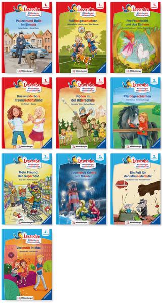 In Zusammenarbeit mit dem Ravensburger Buchverlag wurden 10 Titel aus der erfolgreichen Leseraben-Serie mit dem farbigen Silbentrenner ausgestattet. Damit wurden erstmals Lesebücher aus der aktuellen Kinderliteratur nach der Silbenmethode mit Silbentrenner® lesedidaktisch aufgearbeitet. Die Bände der 1. Lesestufe enthalten ein geringeres Textangebot für Lese-Einsteiger. In der Lesestufe 2 sind die Texte umfangreicher und für fortgeschrittene Leser. Passende Leserabe Arbeitsblätter zu Set 4 sind erhältlich unter ISBN 978-3-619-14616-1. Zu diesem Komplettbezug der Bände 1 bis 10 gehören je ein Exemplar der Titel: Lesestufe 1: • Band 1: Polizeihund Bolle • Band 2: Fußballgeschichten • Band 3: Fee Federleicht und das Einhorn • Band 4: Das wunderbare Freundschaftsband • Band 5: Radau in der Ritterschule Lesestufe 2: • Band 6: Pferdegeschichten • Band 7: Mein Freund, der Superheld • Band 8: Spannende Krimis zum Mitraten • Band 9: Ein Fall für den Mäusedetektiv • Band 10: Verknallt in Max