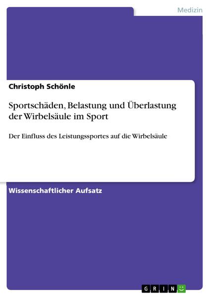 Wissenschaftlicher Aufsatz aus dem Jahr 2010 im Fachbereich Medizin – Chirurgie, Unfall-, Sportmedizin, , Veranstaltung: Orthopädie Sportmedizin, Sprache: Deutsch, Abstract: Belastungen und Überlastungen, aber auch sportbedingte Schäden der Wirbelsäule werden in der orthopädischen Praxis immer wieder diagnostiziert. Verschiedene wissenschaftliche Untersuchungen zeigen eine erhöhte Gefährdung der Wirbelsäule bei intensiver sportlicher Belastung. Während eine gesunde Wirbelsäule selbst durch den Leistungssport kaum geschädigt wird, können bei verschiedenen Fehlformen, Dysplasien (Minderentwicklungen)oder Wirbelsegmentstörungen sportartspezifische Erkrankungen auftreten. Ein florider M. Scheuermann oder ein Bandscheibenschaden wird durch Hyperflexion (maximale Vorbeugung)der Wirbelsäule verschlimmert, während bei Hyperextension(maximale Rückneigung)der Wirbelsäule und gleichzeitiger Assimilationsstörung (knöcherne Entwicklungsstörung) oder Fehlstellung des Sakrums(Kreuzbein)eine Spondylolyse (einseitige Rissbildung im Wirbelgelenkfortsatz)entstehen kann. Dadurch kann in weiteren Verlauf ein Wirbelgleiten (Spondylolisthesis) eintreten. Allerdings kann auch bei einer gesunden Wirbelsäule eine Spondylolyse durch ständige Hyperextension und gleichzeitige Stauchung, Rotation oder Seitkippung der Wirbelsegmente auftreten. Eine Hyperflexion, verbunden mit einer starken Stauchung oder einer axialen Belastung kann einen Bandscheibenvorfall auslösen, selbst wenn keine degenerativen Veränderungen vorliegen. Wirbelsäulenschäden können auch durch leichte Traumen wie Stürze oder Quetschungen ausgelöst werden. Sport induced damages of the spine Different studies show an increased risk for the spine during intensive sport. A healthy spine normally will not be damaged when participating even in high performance sport, but if deviations, dysplasia or diseases are present, sports specific damages can occur. A Scheuermann¿s disease or a lumbar disc degeneration might be deteriorated by repeated hyperflexion movements of the spine, whereas a hyperextension can lead to a spondylolysis, if malassimilation or deviation of the spine or sacrum are existing. Nevertheless a spondylolysis can appear also in a normal and healthy spine, when the hyperextension movement is combined with a high axial load. A hyperextension with additional rotational or side bending forces will have the same effect. A hyperflexion of the spine in combination with a high axial load can induce a disc protrusion or prolaps, even if there ar no degenerative lesions. Falling on the buttock and other direct traumata on the spine can also induce acute or chronic damages of the spine.
