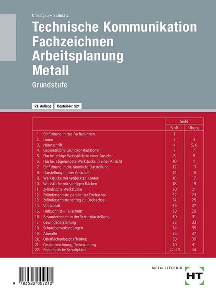 Die 22 Themen zur Einführung in das technische Zeichnen werden meist auf einer Doppelseite behandelt: Auf der linken Seite erschließt sich das Thema (in den meisten Fällen per Lückentext); auf der rechten Seite stehen jeweils vier Übungsaufgaben zur Verfügung, um das erlernte Wissen selbstständig anzuwenden. Die Neuauflage dieses seit vielen Jahren marktführenden Heftes wurde redaktionell überarbeitet und optisch ansprechend aufbereitet.