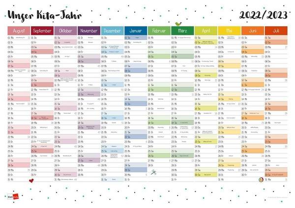 Der Wandkalender für das Kita-Jahr 2022/23 Urlaubstage, Schließzeiten und Ausflüge – behalten Sie den Überblick über alle anstehenden Termine mit dem Wandkalender für das Kita-Jahr 2022/23. Format: DIN A1