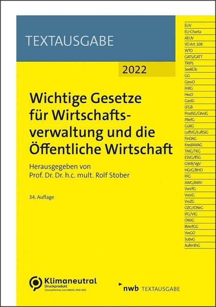 Diese NWB Textausgabe vereint alle wichtigen Gesetze des Wirtschaftsverwaltungsrechts in einem Band – einschließlich der gewerberechtlichen Vorschriften und der wichtigsten Gesetze des Öffentlichen Rechts. Klar gegliedert und strukturiert bietet Ihnen diese preisgünstige Gesetzessammlung einen schnellen Zugriff auf alle in der täglichen Praxis benötigten Informationen. Bewährte Detaillösungen, wie die praktische Griffleiste, die Kennzeichnung der Änderungen im Vergleich zur Vorauflage und das ausführliche Stichwortverzeichnis, unterstützen Sie zusätzlich. Ab dieser Ausgabe entfallen jene Gesetze, die Vorschriften zur ökologischen Verantwortung enthalten. Diese gehen stattdessen demnächst in eine neue Textausgabe ‚Wichtige Klimaschutzgesetze für Unternehmen, Verbände und Verbraucher‘ ein. In dieser Ausgabe zusätzlich neu aufgenommen wurde das Gesetz über überwachungsbedürftige Anlagen. Weiterhin sind unter anderem folgende Änderungen berücksichtigt: Gesetz zur Anpassung des Produktsicherheitsgesetzes und zur Neuordnung des Rechts der überwachungsbedürftigen Anlagen, Gesetz zur Änderung der Handwerksordnung und anderer handwerksrechtlicher Vorschriften sowie Zweites Gesetz zur Änderung des Geetzes zur vorläufigen Regelung des Rechts der Industrie- und Handelskammern. Inhalte digital in der App nutzbar! Stand: 1. März 2022. Inhaltsverzeichnis: 1. Vertrag über die Europäische Union. 2. Charta der Grundrechte der Europäischen Union. 3. Vertrag über die Arbeitsweise der Europäischen Union (+ Prot. 1, 2, 6, 12, 13, 19 AEUV). 4. Verordnung (EU) 2015/1589 des Rates über besondere Vorschriften für die Anwendung von Artikel 108 des Vertrags über die Arbeitsweise der Europäischen Union. 5. Übereinkommen zur Errichtung der Welthandelsorganisation. 6. Allgemeines Übereinkommen über den Handel mit Dienstleistungen – Auszug. 7. Allgemeines Zoll- und Handelsabkommen 1994 – Auszug. 8. Übereinkommen über handelsbezogene Aspekte der Rechte des geistigen Eigentums – Auszug. 9. Seerechtsübereinkommen der Vereinten Nationen – Auszug. 10. Grundgesetz für die Bundesrepublik Deutschland. 11. Gewerbeordnung. 12. Gesetz zur vorläufigen Regelung des Rechts der Industrie- und Handelskammern. 13. Gesetz zur Ordnung des Handwerks. 14. Gaststättengesetz. 15. Lebensmittel-, Bedarfsgegenstände- und Futtermittelgesetzbuch. 16. Gesetz über die Bereitstellung von Produkten auf dem Markt. 17. Gesetz über überwachungsbedürftige Anlagen. 18. Personenbeförderungsgesetz – Auszug. 19. Güterkraftverkehrsgesetz. 20. Luftverkehrsgesetz. 21. Luftsicherheitsgesetz. 22. Gesetz über die Bundesanstalt für Finanzdienstleistungsaufsicht. 23. Gesetz über die Kreditanstalt für Wiederaufbau. 24. Telemediengesetz. 25. Telekommunikationsgesetz. 26. Ernährungssicherstellungs- und -vorsorgegesetz. 27. Infektionsschutzgesetz – Auszug. 28. Gesetz gegen Wettbewerbsbeschränkungen – Auszug. 29. Verordnung über die Vergabe öffentlicher Aufträge. 30. Gesetz über die Grundsätze des Haushaltsrechts des Bundes und der Länder – Auszug. 31. Bundeshaushaltsordnung – Auszug. 32. Filmförderungsgesetz – Auszug. 33. Außenwirtschaftsgesetz. 34. Außenwirtschaftsverordnung. 35. Verwaltungsverfahrensgesetz – Auszug. 36. Verwaltungs-Vollstreckungsgesetz. 37. Verwaltungszustellungsgesetz. 38. Onlinezugangsgesetz. 39. Identifikationsnummerngesetz. 40. Gesetz zur Regelung des Zugangs zu Informationen des Bundes. 41. Gesetz zur Verbesserung der gesundheitsbezogenen Verbraucherinformation. 42. Gesetz über Ordnungswidrigkeiten – Auszug. 43. Gesetz über das Bundesverfassungsgericht – Auszug. 44. Verwaltungsgerichtsordnung – Auszug. 45. Gesetz gegen missbräuchliche Inanspruchnahme von Subventionen – Auszug (+ 264, 299 StGB). 46. Gesetz über den Aufenthalt, die Erwerbstätigkeit und die Integration von Ausländern im Bundesgebiet – Auszug (+ 61 AsylG).