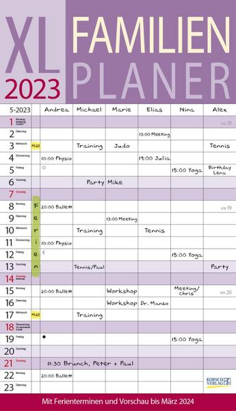 Produktmerkmale Übersichtlicher Familienplaner mit 6 großen Spalten; sehr stabile Rückwand ; 27 x 47 cm Praktische Zusatzspalte für Ferien, Müll und weitere Aktivitäten Terminkalender mit viel Platz für Eintragungen, ohne störende Bilder in den Spalten leichte Beschreibbarkeit , auch mit Bunt- und Bleistiften Deutsches Kalendarium mit regionalen Feiertagen für Deutschland, Österreich und Schweiz Farblich hervorgehobene Sonn- und Feiertage, sowie Anzeige der Zeitumstellung Gedruckt auf dickem und umweltfreundlichem Korsch Familienkalender XL – Großer Jahreskalender für Familien Angesagte Pastelltöne in Kombination mit edlem grau, machen diesen Kalender zu einem echten Hingucker an der Wand. Dieser Wandkalender hilft Ihnen dabei alle wichtigen Termine stets im Blick zu haben. Das dicke Papier sorgt für eine leichte Beschreibbarkeit , auch mit Bunt- oder Bleistiften. Mit sechs Spalten zum Eintragen von Geburtstagen, Terminen und Erinnerungen bietet der Familienkalender XL viel Platz für Notizen . Damit ist es auch möglich mehrere Termine in einen Tag zu schreiben. Der Organisation des Alltags von großen und kleinen Familien steht somit nix mehr im Weg. Neben dem gesamten Kalenderjahr enthält der Wandplaner auch eine Vorschau bis März des Folgejahres. Weitere Informationen wie Mondphasen , Ferientermine und Feiertage (auch regionale) sowie deutlich lesbare Kalenderwochen runden den Kalender ab und sorgen für einen vollständigen Überblick Ihres Jahres.
